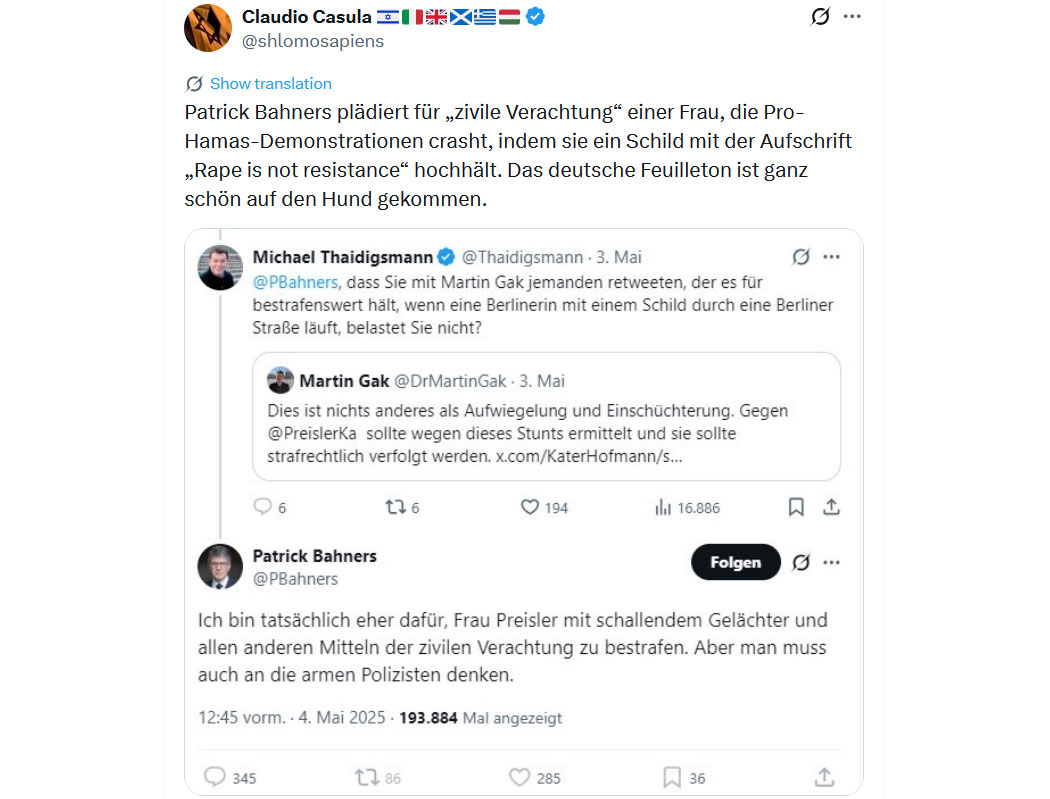Angesichts der massiv fortschreitenden Islamisierung wird Antisemitismus als Überlebenstechnik und als Vehikel gesehen, man bereitet schon mal das eigene, spätere "Auf-der-richtigen-Seite-Stehen" vor. So ekelerregend es ist, aus der Sicht der Schlichten und wenig Gefestigten macht es sogar Sinn. Keinen Sinn macht es, noch dagegen zu argumentieren und Energie zu verschwenden. Die doitsch-islamische Walze wird keiner mehr aufhalten.