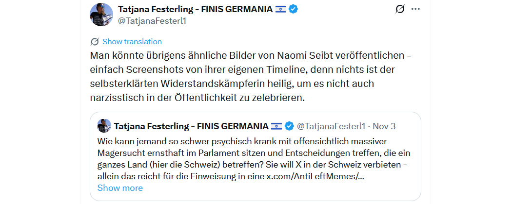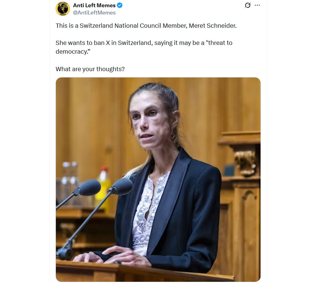 Wie kann jemand so schwer psychisch krank mit offensichtlich massiver Magersucht ernsthaft im Parlament sitzen und Entscheidungen treffen, die ein ganzes Land (hier die Schweiz) betreffen? Sie will X in der Schweiz verbieten - allein das reicht für die Einweisung in eine Psychiatrie. Die Frau braucht Hilfe, aber ganz sicher keine öffentliche Plattform, auf der sie ihr Sterben zelebrieren kann.