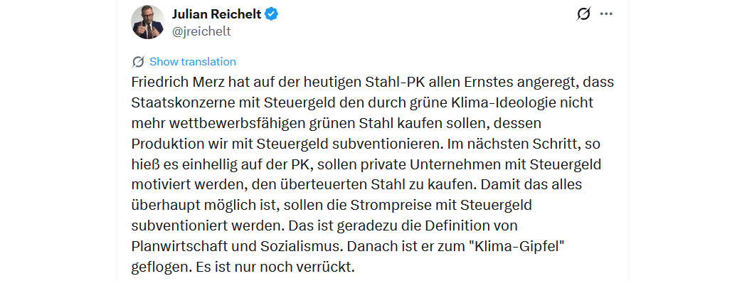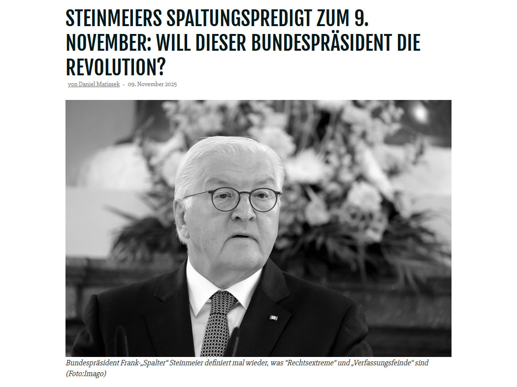 "Was Frank-Spalter Steinmeier (der schon seit Amtsbeginn das vor ihm sieben Jahrzehnte lang von all seinen Vorgängern stets respektierte Neutralitätsgebot verächtlich mit Füßen trat) heute, mit seinem Appell zur “Verteidigung der Demokratie” und dem Ruf nach “Widerstand gegen Rechtsextremismus” betrieben hat, das ist schon keine Spaltung mehr. Das ist faktische Aufwiegelung. Warum? Weil er mit “Demokratie” die eigentlichen Antidemokraten meint und mit “Rechtsextremismus” alle völlig grundgesetzkonformem, liberal-konservativem und bürgerlichen Positionen des gesunden Menschenverstandes, die bis vor kurzem von den angeblichen “Demokratierettern” selbst vertreten wurde. Alles, was die verheerende linksgrüne Ideologie und die Macht ihrer Protagonisten bedroht, wird jetzt unter Zweckentfremdung von Verfassungsschutzbehörden und regierungsnahen Propagandamedien kriminalisiert und in einer der monströsesten Projektionen aller Zeiten zur Wiedergeburt des Faschismus umgelogen. Und immer mehr Menschen dämmert, welche Lüge ihnen hier zugemutet wird. Nun sogar vom deutschen Bundespräsidenten, der das schicksals- und geschichtsträchtige Datum des 9. November für eine der abgefeimtesten und infamsten Wirklichkeitsverzerrungen aller Zeiten missbraucht, um ein ins Wanken geratenes Kartell (und vor allem seine sterbende SPD) irgendwie vor dem Untergang zu bewahren."
