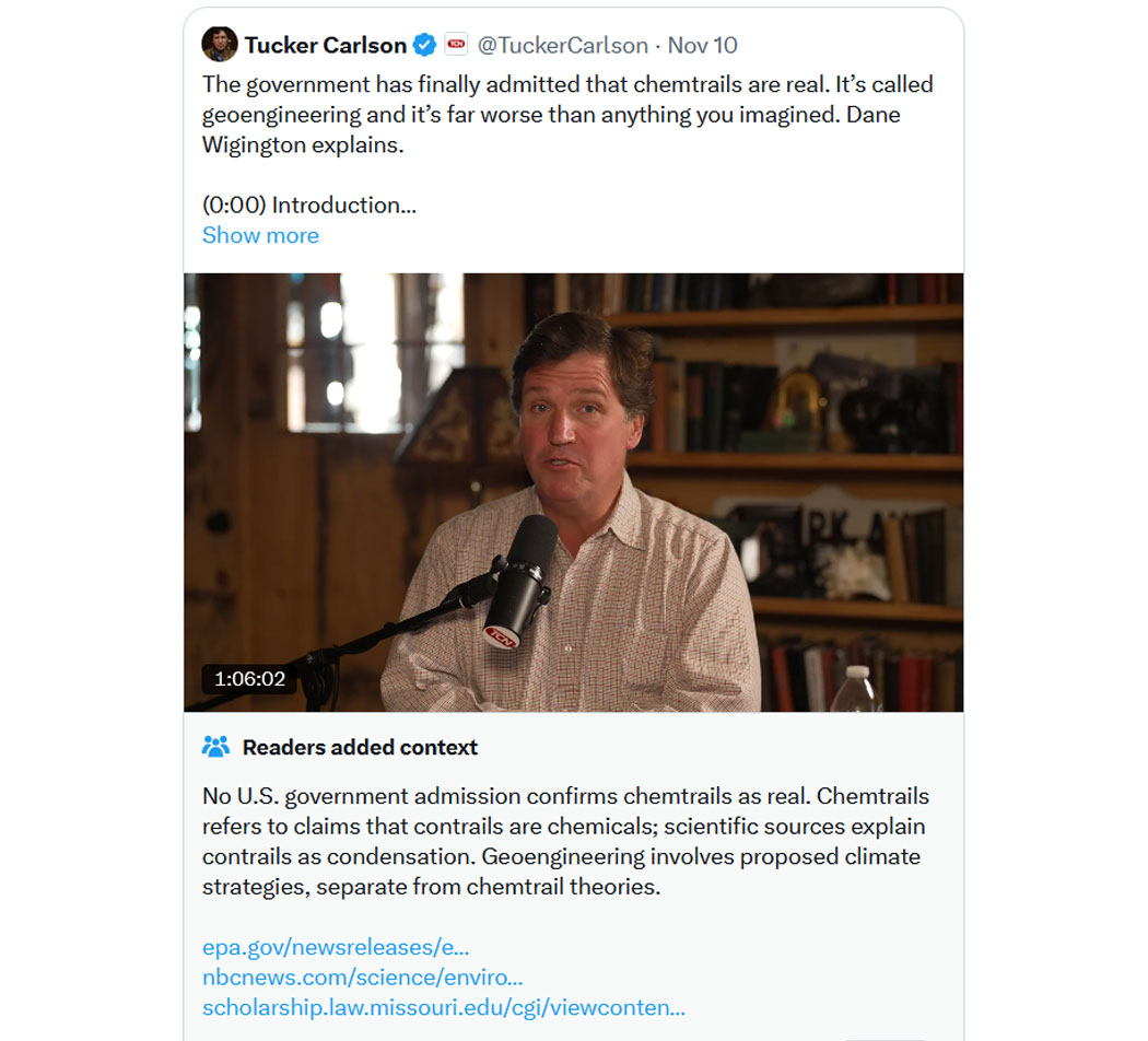 Meine Fresse, was für ein Absturz von Tucker Carlson in die irre Welt der Verschwörungsheinis! Er und die inzwischen völlig durchgeknallte Candice Owens liefern sich offensichtlich so eine Art Wettstreit im Aufbau neuer Kult-Bewegungen, mit denen sie den Zusammenhalt der MAGA-Bewegung zerstören. Erst ist für ihn an allem Übel in der Welt "der Jude" verantwortlich, jetzt schwafelt er mit staatstragender Besorgnis von Chemtrails - natürlich wird er am Ende des Tages herausfinden, dass "die Zionisten" die Flugzeuge heimlich mit Tonnen von Chemikalien beladen blabla. Je grotesker die Inhalte werden, desto offensichtlicher wird es, dass die beiden Zersetzungsagenten sind. Hoffentlich findet die Trump-Administration zügig raus, auf wessen Gehaltsliste diese Typen stehen.