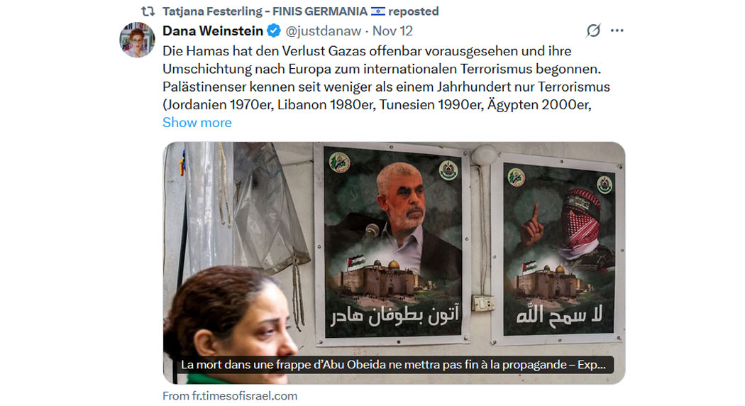 Die antisemitische Gosse blüht und gedeiht - es werden immer mehr, die ungehemmt rauslassen, was sie jahrzehntelang zügeln mussten. Gedeckt von Gestalten wie Fuentes, Carlson und deutschen, sogenannten "etablierten Journalisten" wie diese Type von der FAZ: Alle geben sich durch ihre noch verbrämten Aussagen gegenseitig Deckung - so bereiten sie den Schulterschluss (bzw ihre Unterwerfung) mit dem Islam vor. Aus deren Sicht ist es eine Überlebenstechnik. Angesichts der realen Gefahren durch die Islamisierung fallen alle um wie die Fliegen, Israel kann sich auf niemanden verlassen.