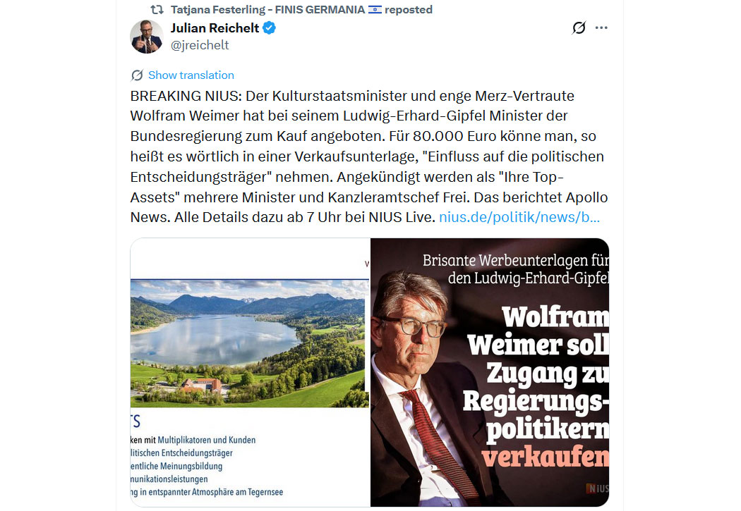 Interssiert es jemanden, also beispielsweise den sogenannten "Staatsschutz", dass in Deutschland offensichtlich Korruption in den höchsten Staatsämtern betrieben wird? Ich weiß, rhetorische Frage. Der Filz in der Parteiendiktatur muss gigantisch sein.